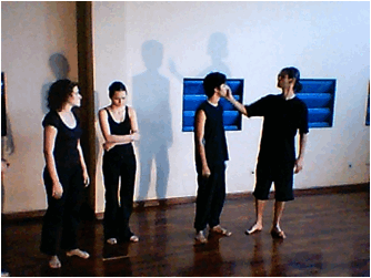 Dividiam-se esses encontros, basicamente, em duas etapas: uma teórica, em que eram discutidos textos propostos em função dos objetivos, e outra, de caráter prático, por meio de aquecimentos, exercícios e trabalho com a cena.